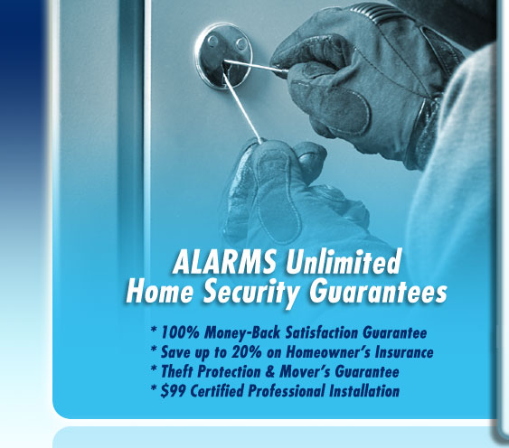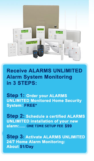 Agreement required at $34.99 per month. Form of payment must be by credit card or electronic check. Offer applies to homeowners only. Local permit fees may be required. Satisfactory credit history required. Certain restrictions may apply. Offer valid for new Alarms Unlimited customers only and not on purchases from Alarms Unlimited Inc. Other rate plans available. Cannot be combined with any other offer. Actual alarm systems may vary from items pictured. Your privacy does matter! - By submitting this form, you are requesting more information and are under no obligation to make a purchase. Your information is secured and absolutely private
